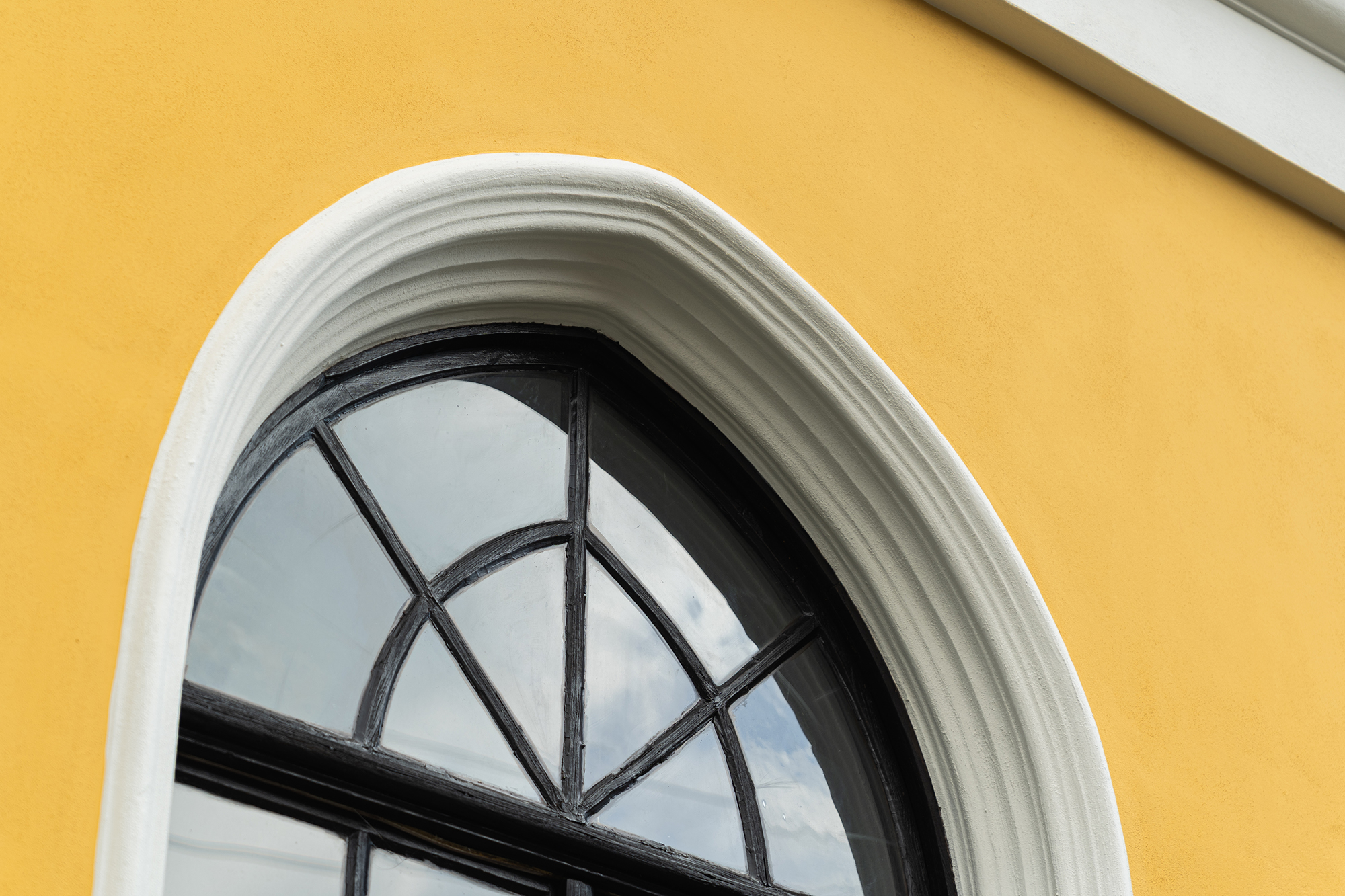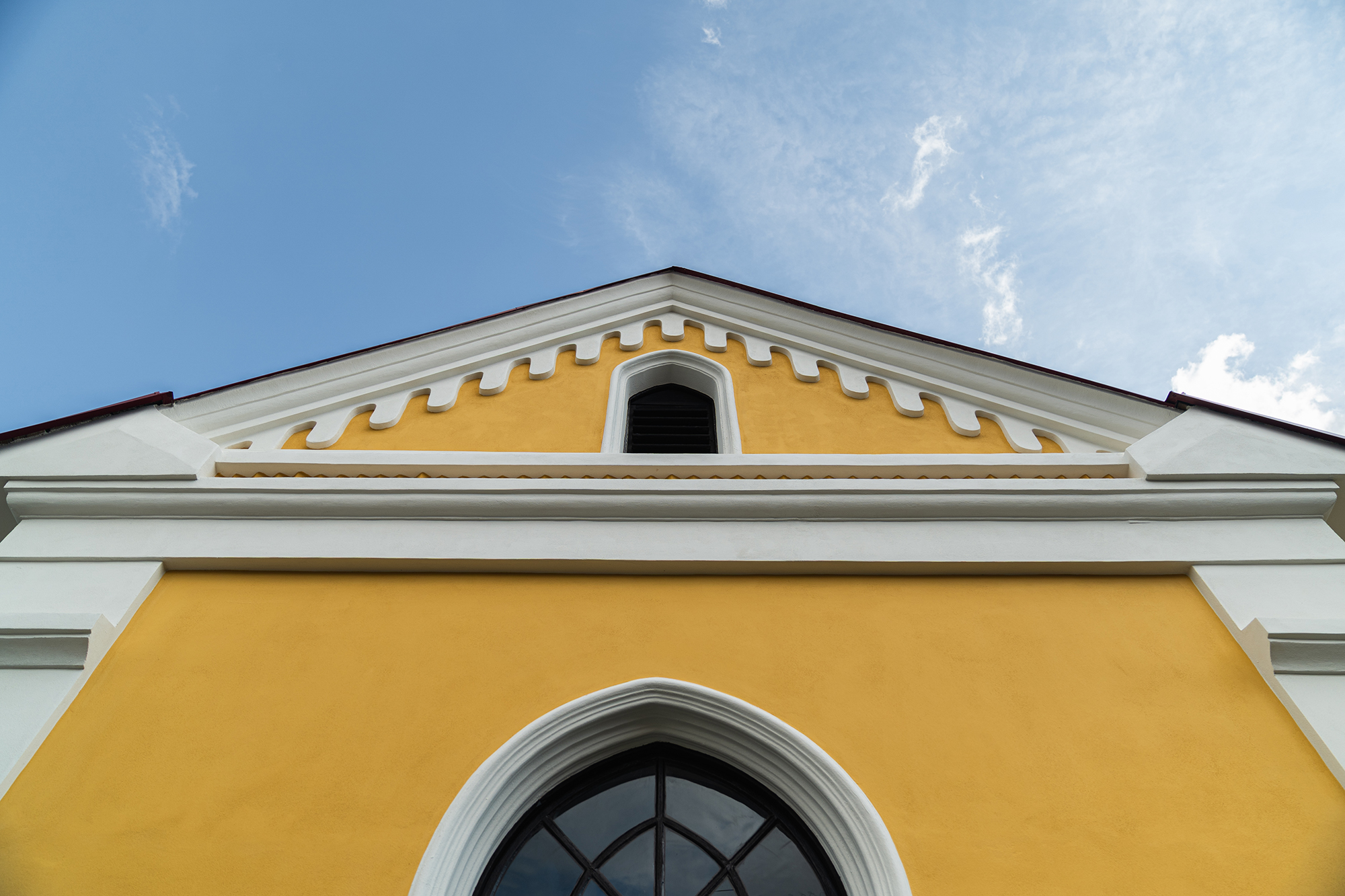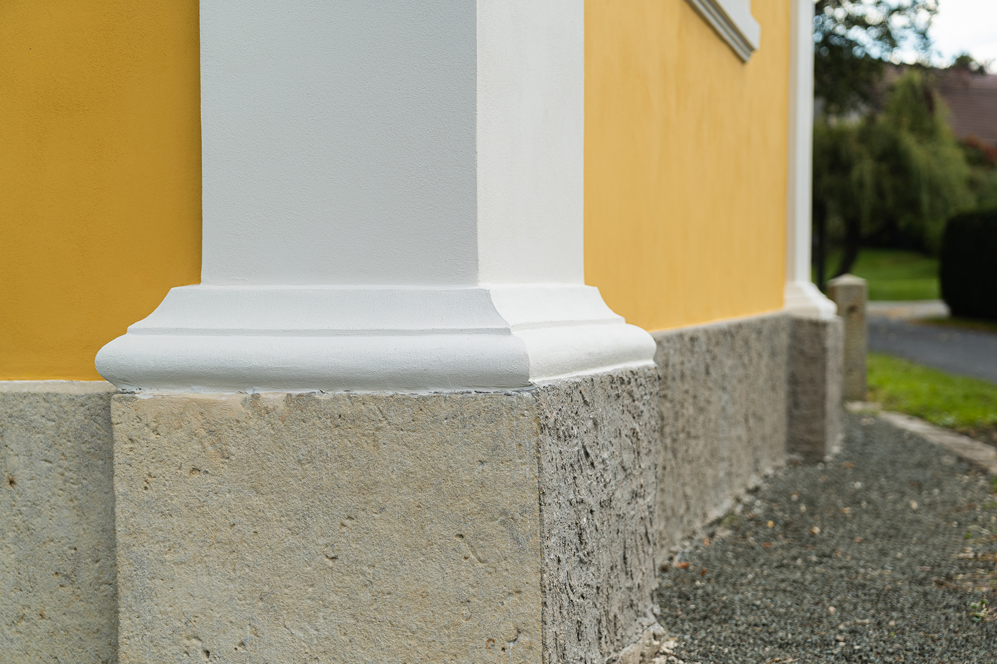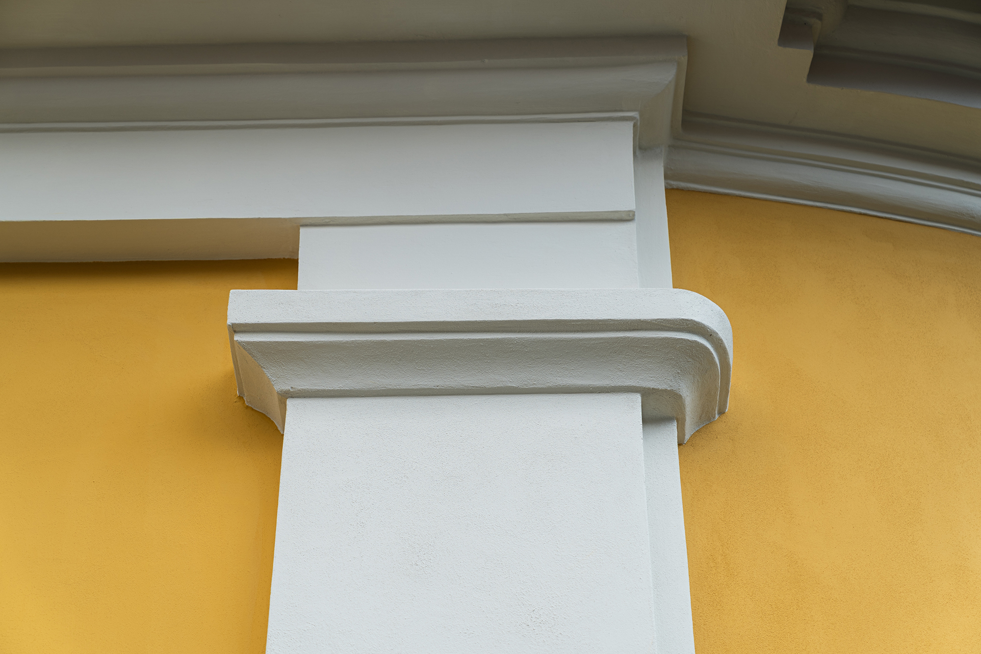 - Finální nátěry – povrch fasády je ošetřen barvou na bázi sol-silikátových pojiv, která je vhodná pro organické, minerální i smíšené podklady. Barevné řešení respektuje původní vzhled: bílá tektonika a žluté hlavní plochy.