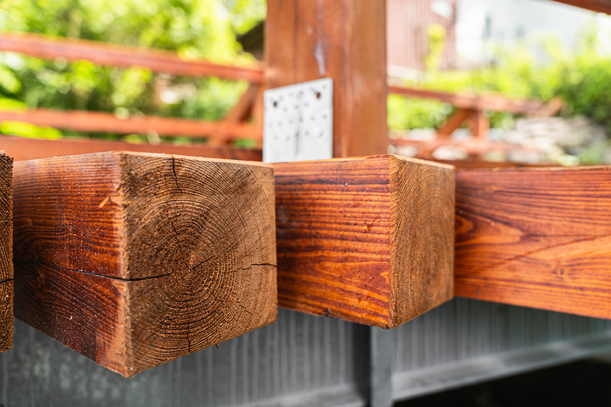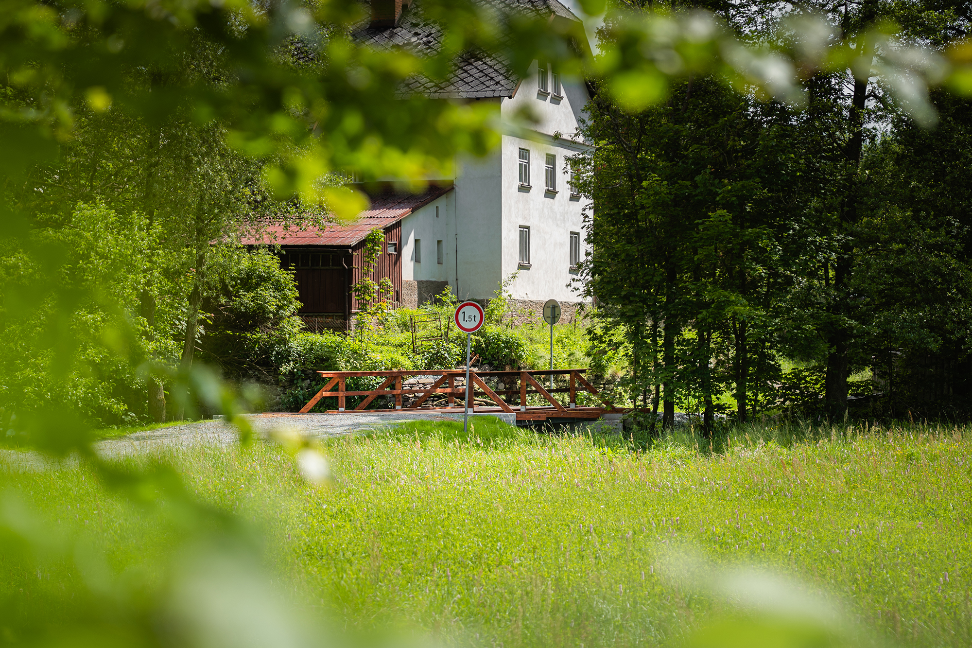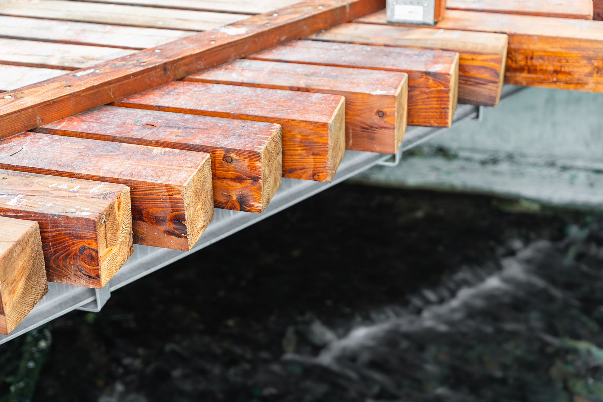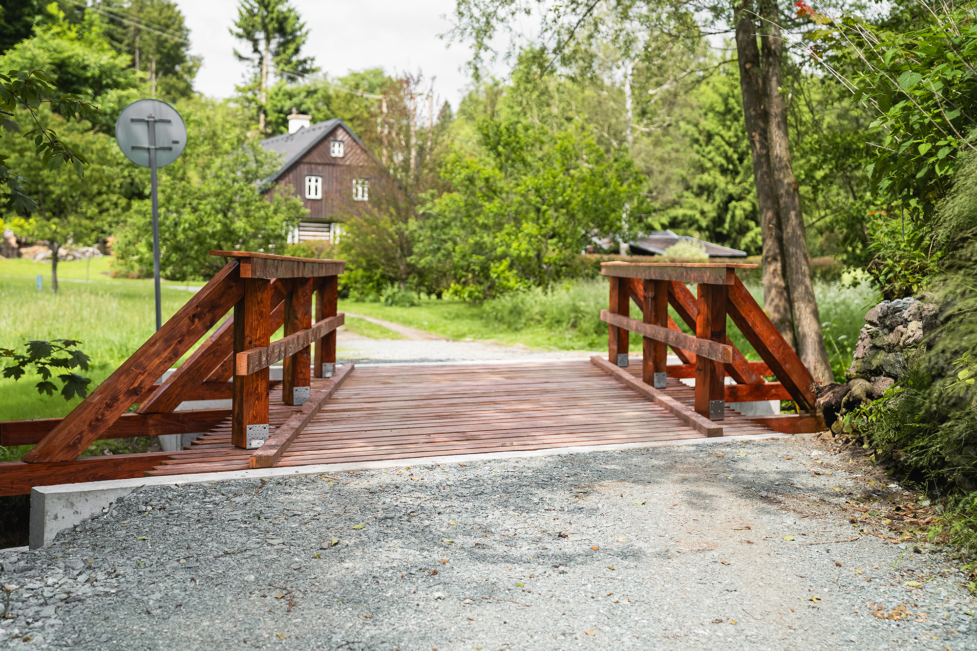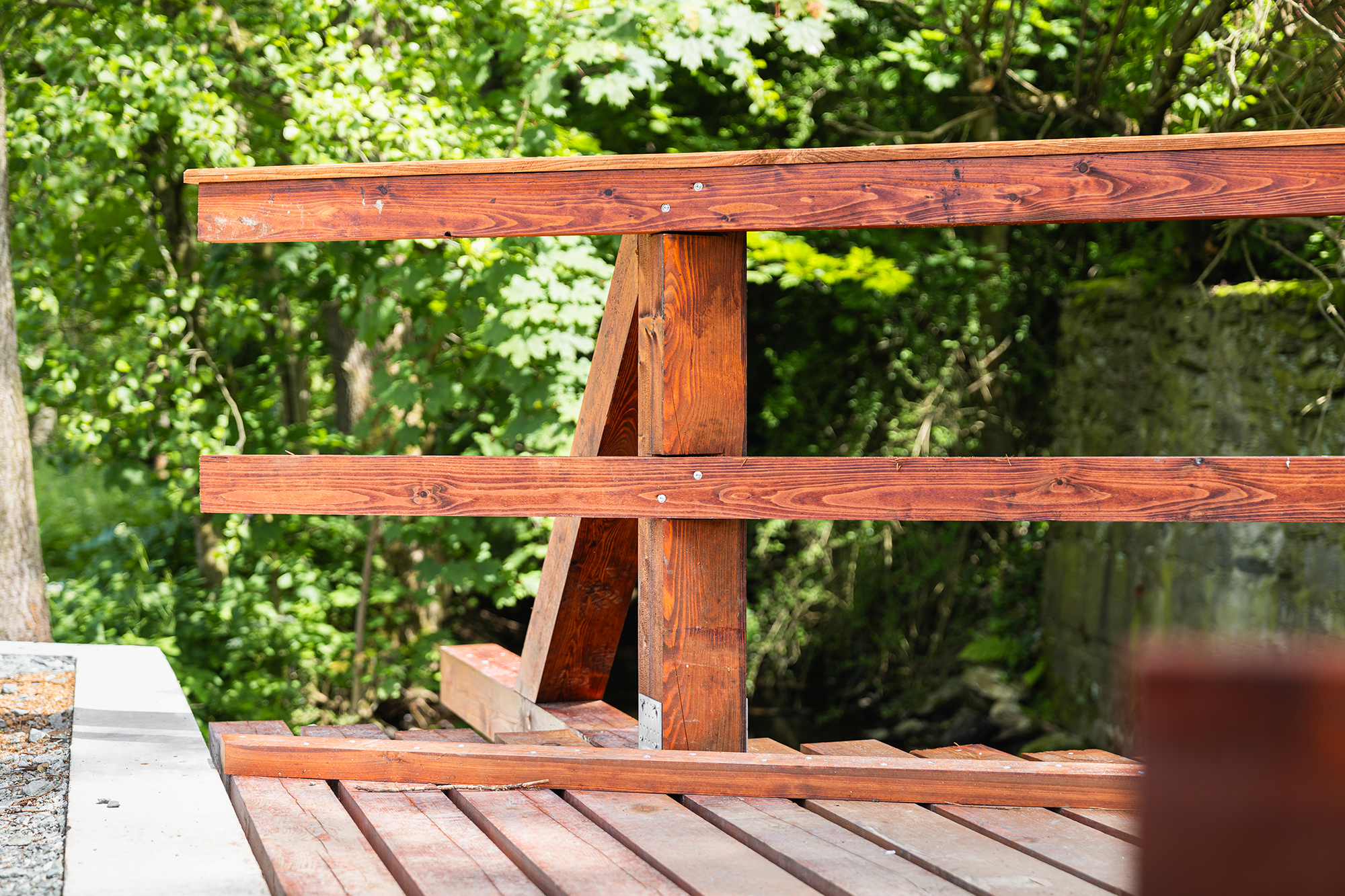 Pro obnovu konstrukce jsme použili kvalitní smrkové a modřínové konstrukční dřevo, které je ošetřeno proti vlhkosti, houbám i dřevokaznému hmyzu. Povrchová úprava lazurou chrání materiál před povětrnostními vlivy, zároveň zvýrazňuje přirozenou kresbu dřeva a dodává mostu estetický, přírodní vzhled zapadající do okolní zeleně.